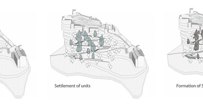 Observation cabins which don’t include program, form the basis of the scenario. These cabins, homogeneously spread over the area, emphasize that where we are is not important for the observation. Also, these cabins increase the potential of the publicity of this area. Morphologically, the hexagon base shaped units have been designed to provide a possibility to articulate and assemble different forms. In this way, units that include several programs could be designed by the same attitudes. Then the assembled units could adopt the area with their own tectonic behavior perfectly. The path is designed in parallel with the slope and connected with upper and lower levels of the units. The path arrives at the castle and completes its formation without touching it.